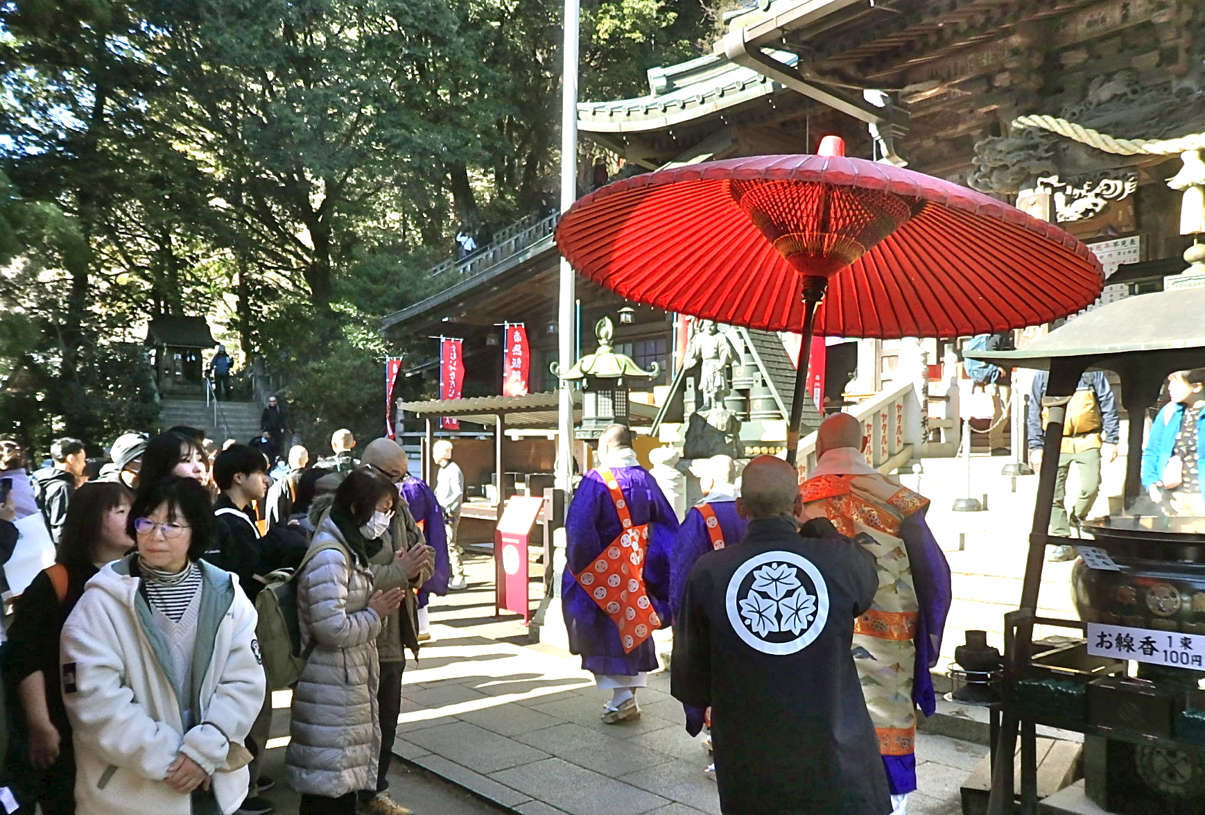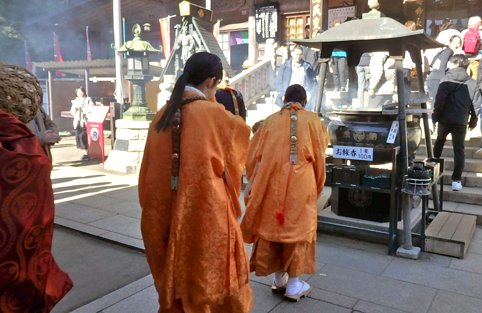 参拝が終わったタイミングで大太鼓が鳴り始めると、ホラ貝の音が聞こえ、間もなく護摩祈祷の山伏たちが上がってきました。間近でみるのは初めてなので、ありがたい参拝となりました。