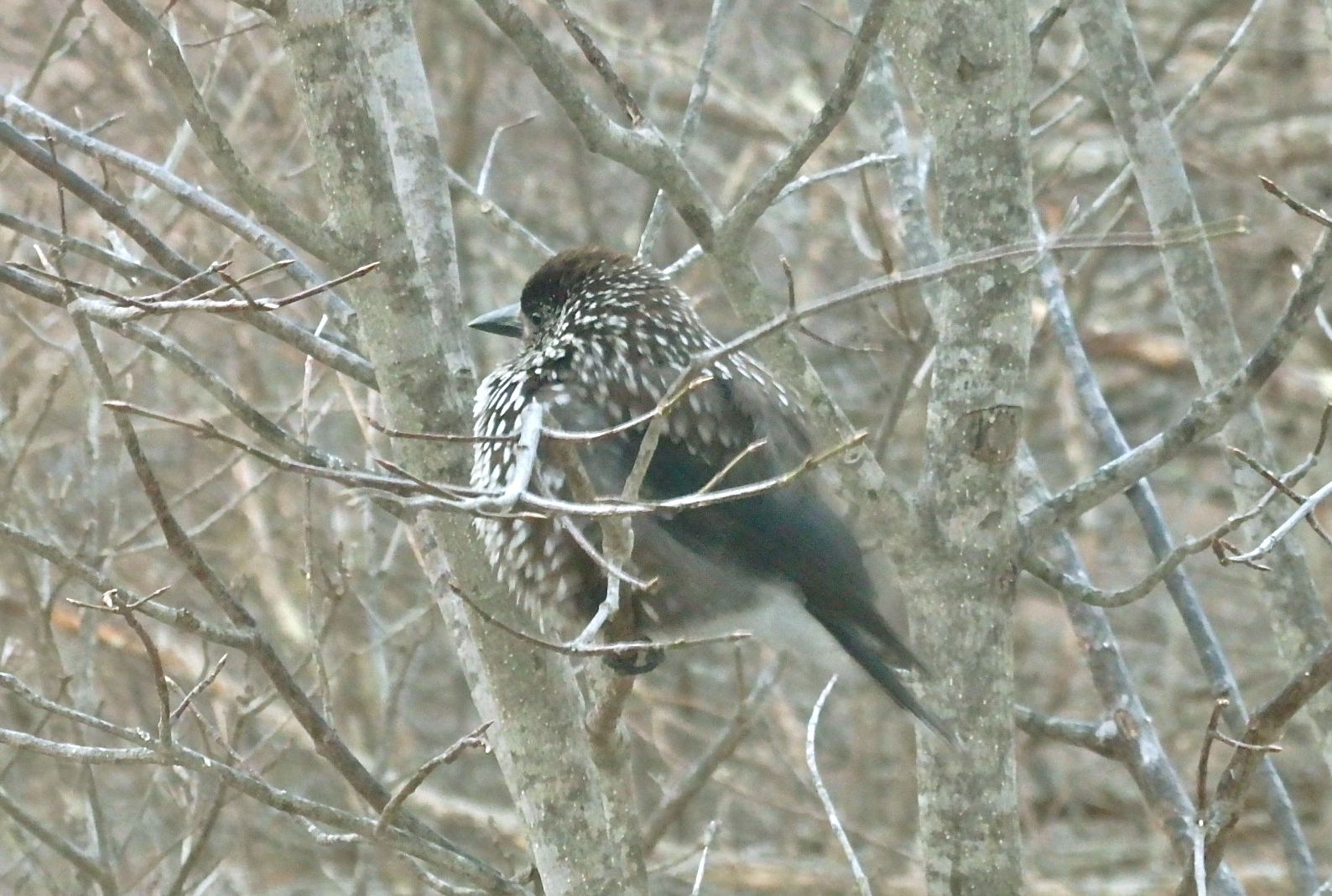 早起きをして餌台を見ると、沢山のホシガラスが囲んでいた。こちらは天敵に注意しながらエサの一つを取ると、すぐに飛び去っていく。シジュウカラ、コガラ、ヤマガラ、カワラヒナも目まぐるしく取っては去りを繰り返していく。