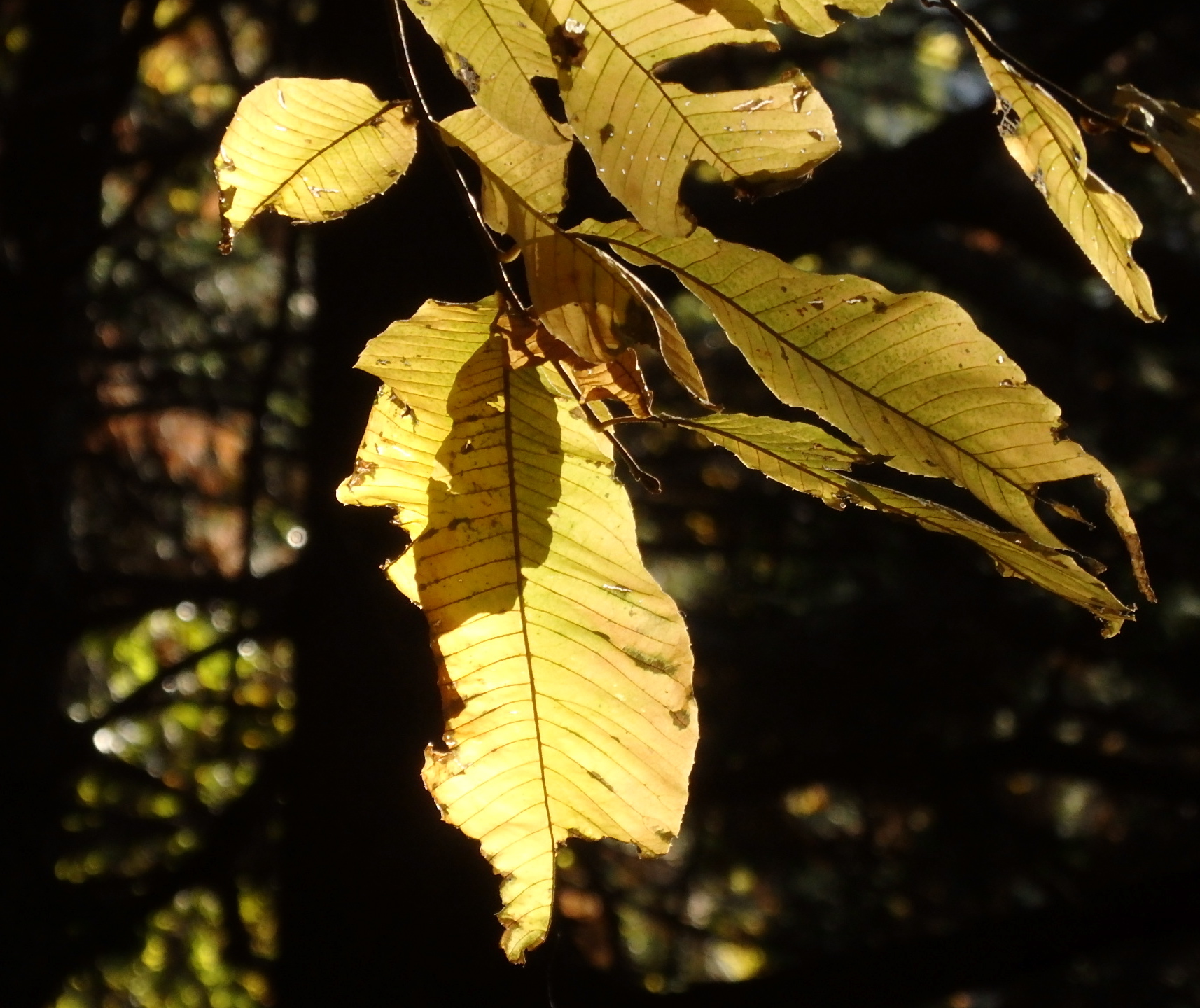 翅がボロボロになっている。クロアゲハだろうか。アザミの花に停まって少ない蜜を吸っている。すでに10月だというのに、まだ生息している。